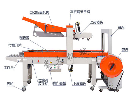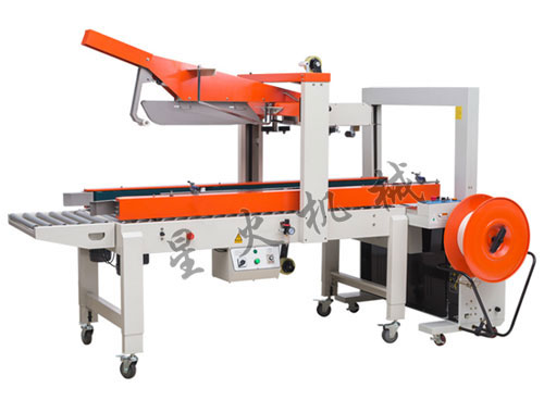 該全自動(dòng)折蓋封箱打包機(jī)由XHC-50自動(dòng)折蓋封箱機(jī)和自動(dòng)捆扎機(jī)組成,采用先進(jìn)技術(shù)制造,并選用進(jìn)口零部件,電器零件及氣動(dòng)元件,功能集自動(dòng)折蓋、封箱及捆扎為一體,具有連續(xù)自動(dòng)折蓋、上下封箱、多道捆扎包裝功能;實(shí)現(xiàn)封箱捆扎自動(dòng)化、節(jié)省生產(chǎn)成本。具有自動(dòng)停線(xiàn)、自動(dòng)喚醒功能?赏ㄟ^(guò)簡(jiǎn)單方便的調(diào)整實(shí)現(xiàn)紙箱規(guī)格的變換,本機(jī)可通過(guò)旋轉(zhuǎn)按鈕來(lái)控制打一道或者兩道,自動(dòng)化程度高、效率更高。